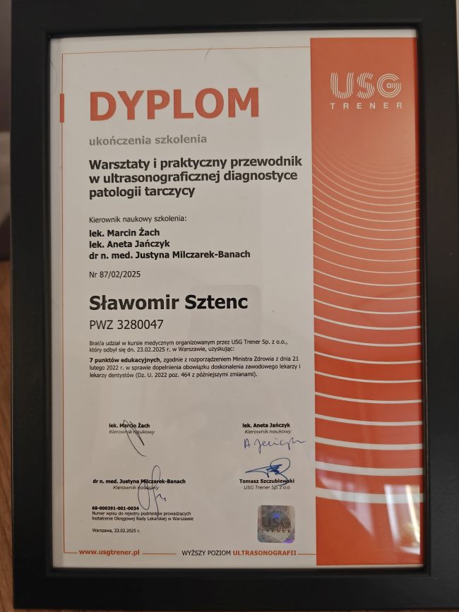Z przyjemnością informuję o ukończeniu kursu "Warsztaty i praktyczny przewodnik w ultrasonograficznej diagnostyce patologii tarczycy". Szkolenie pozwoliło mi wzbogacić wiedzę w zakresie chorób tarczycy, szczególnie w obszarach: